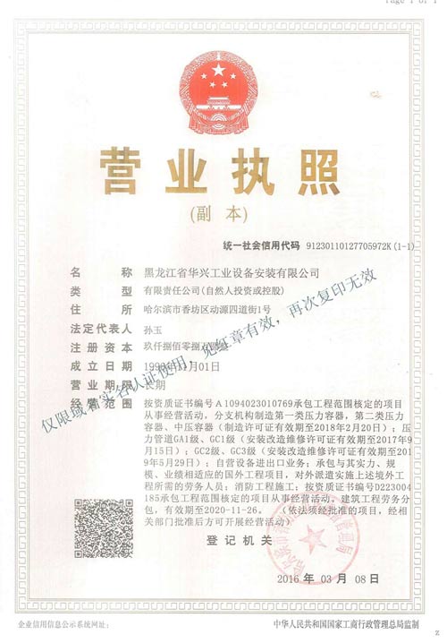 公司现具有化工石油工程施工总承包壹级资质;房屋建筑工程和市政公用工程施工总承包贰级资质;钢结构工程、防腐保温工程、机电设备安装工程、化工石油设备管道安装工程、管道工程等五项专业承包贰级资质以及消防工程施工叁级资质。具有《中华人民共和国对外承包工程许可证》、《A1、A2级压力容器制造许可证》、《GA1、GC1级压力管道安装改造维修许可证》、《I级锅炉安装改造维修许可证》及《安全生产许可证》等施工许可。2011年公司又取得了GB/T50430-2007质量管理体系、Q/SY1002.1-2007健康安全环境管理体系、GB/T28001-2011职业健康安全管理体系、GB/T24001-2004环境管理体系的认证。